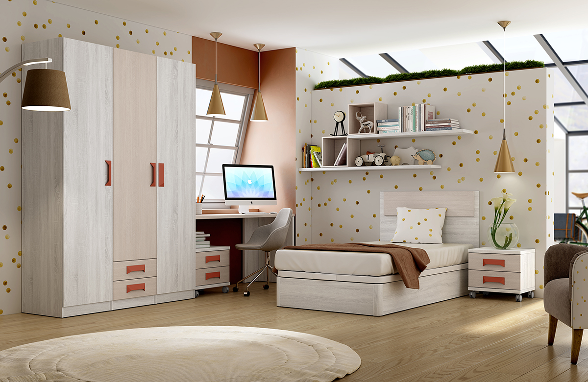 Habitaciones juveniles en chapa sintética con detalles metálicos en negro, cobre y oro