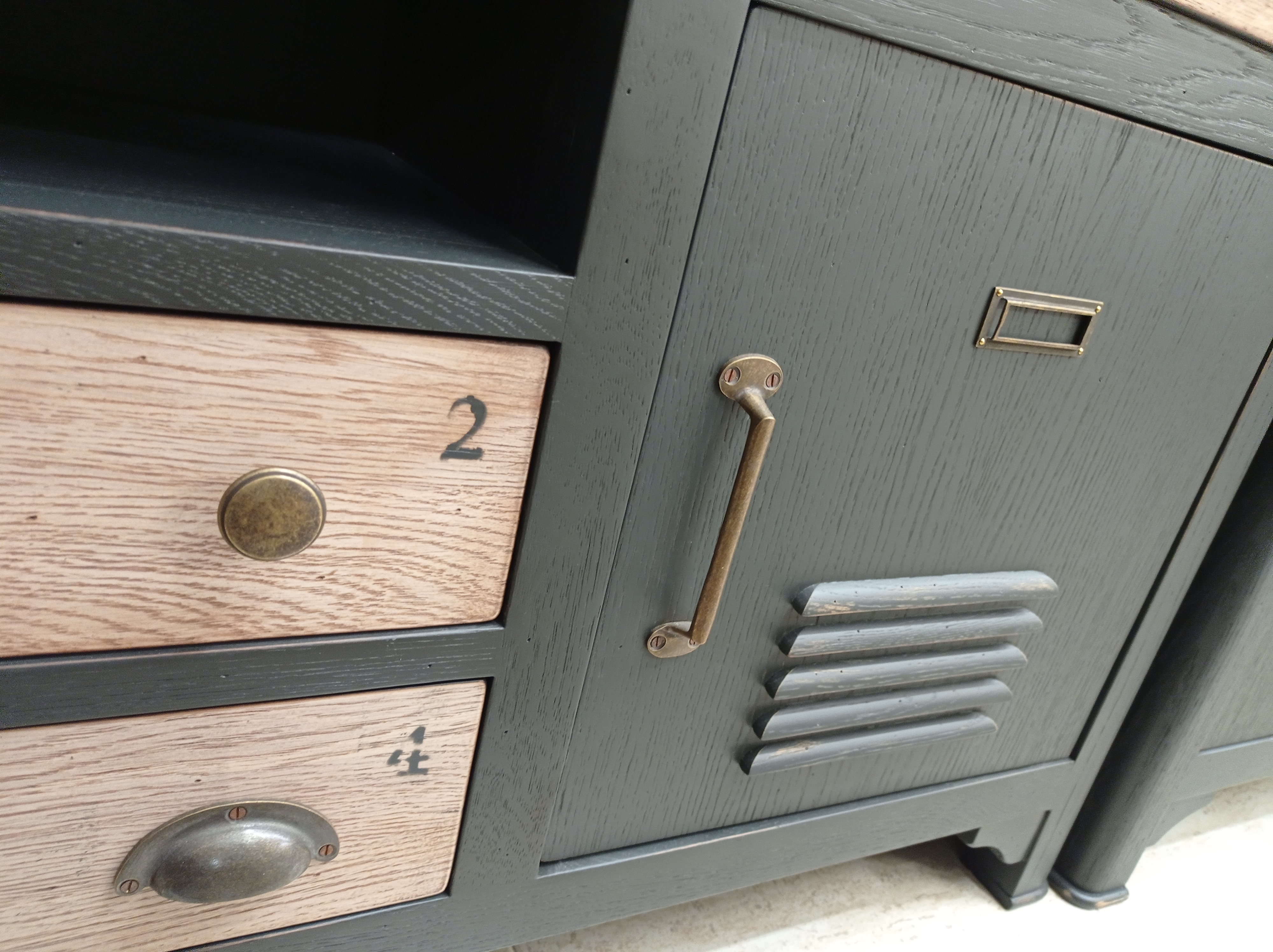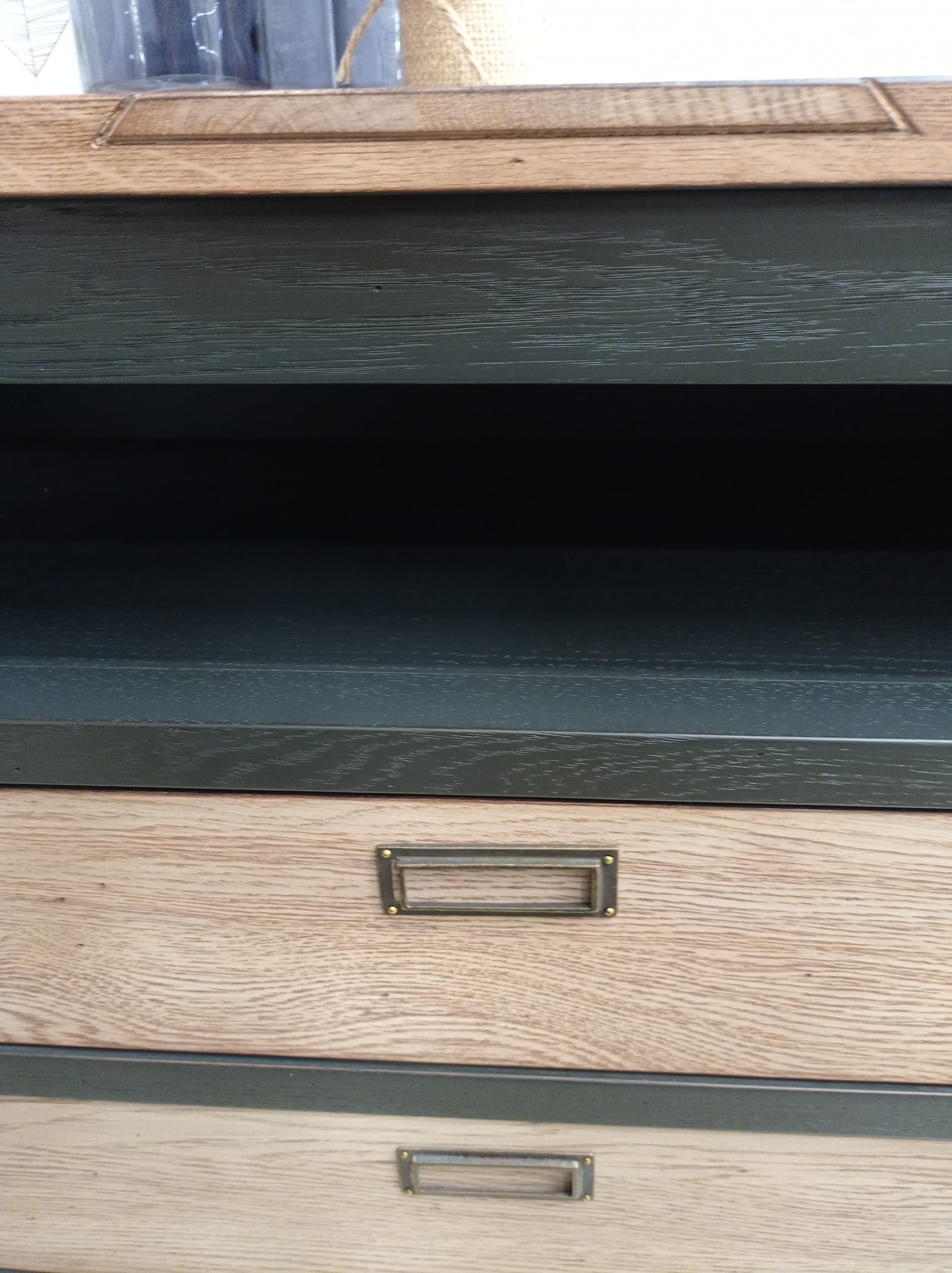 Mesa TV - 180 CM Roble macizo natural estilo industrial, con el roble al natural y lacado negro.