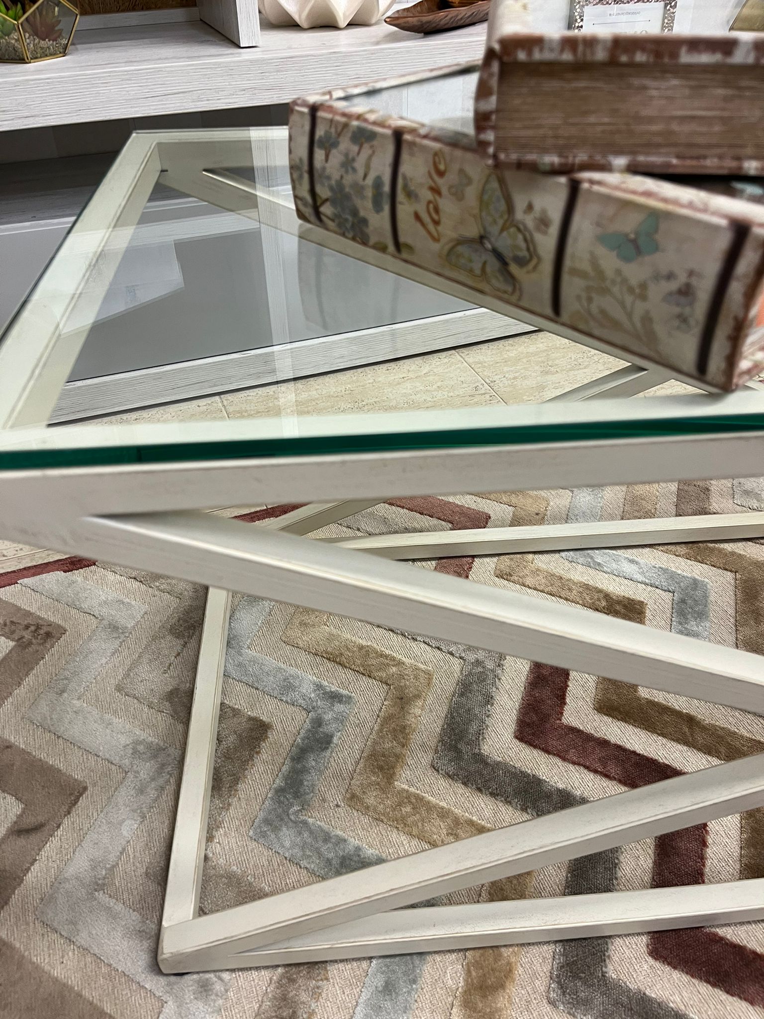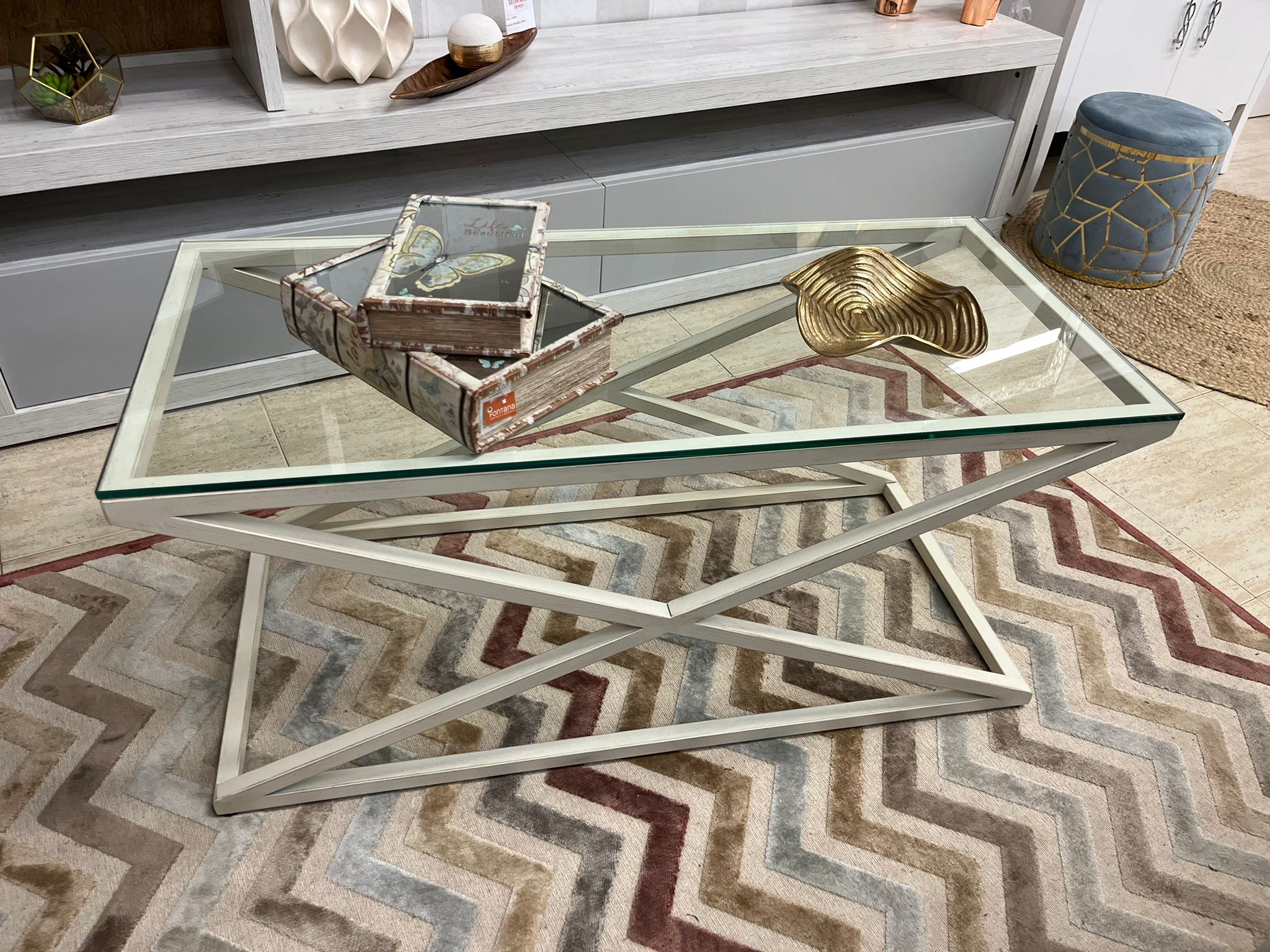 Mesa de centro con estructura de hierro en blanco roto envejecido y tapa de cristal. Medidas: 110cm largox50cm ancho x52cm alto