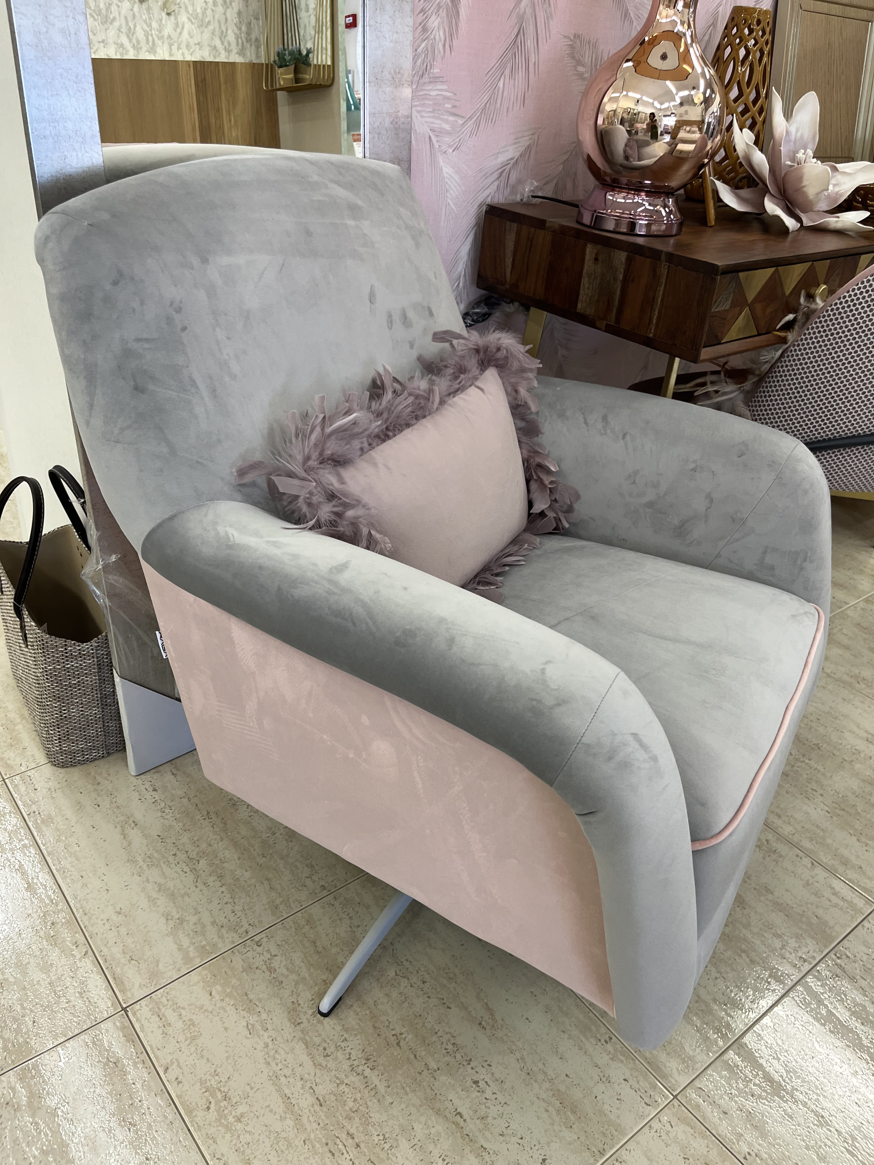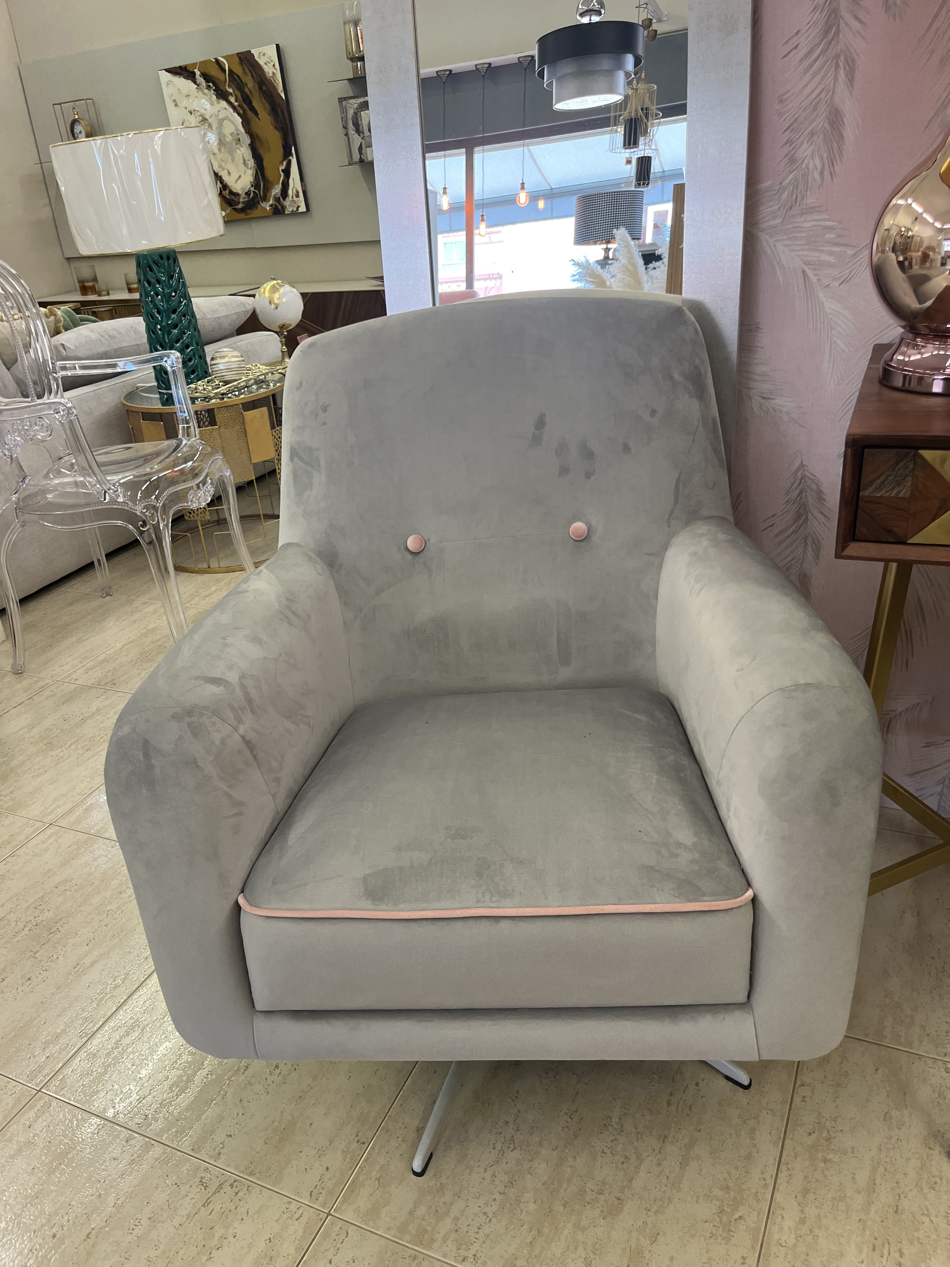 Butaca tapizada giratoria con estructura metálica gris.