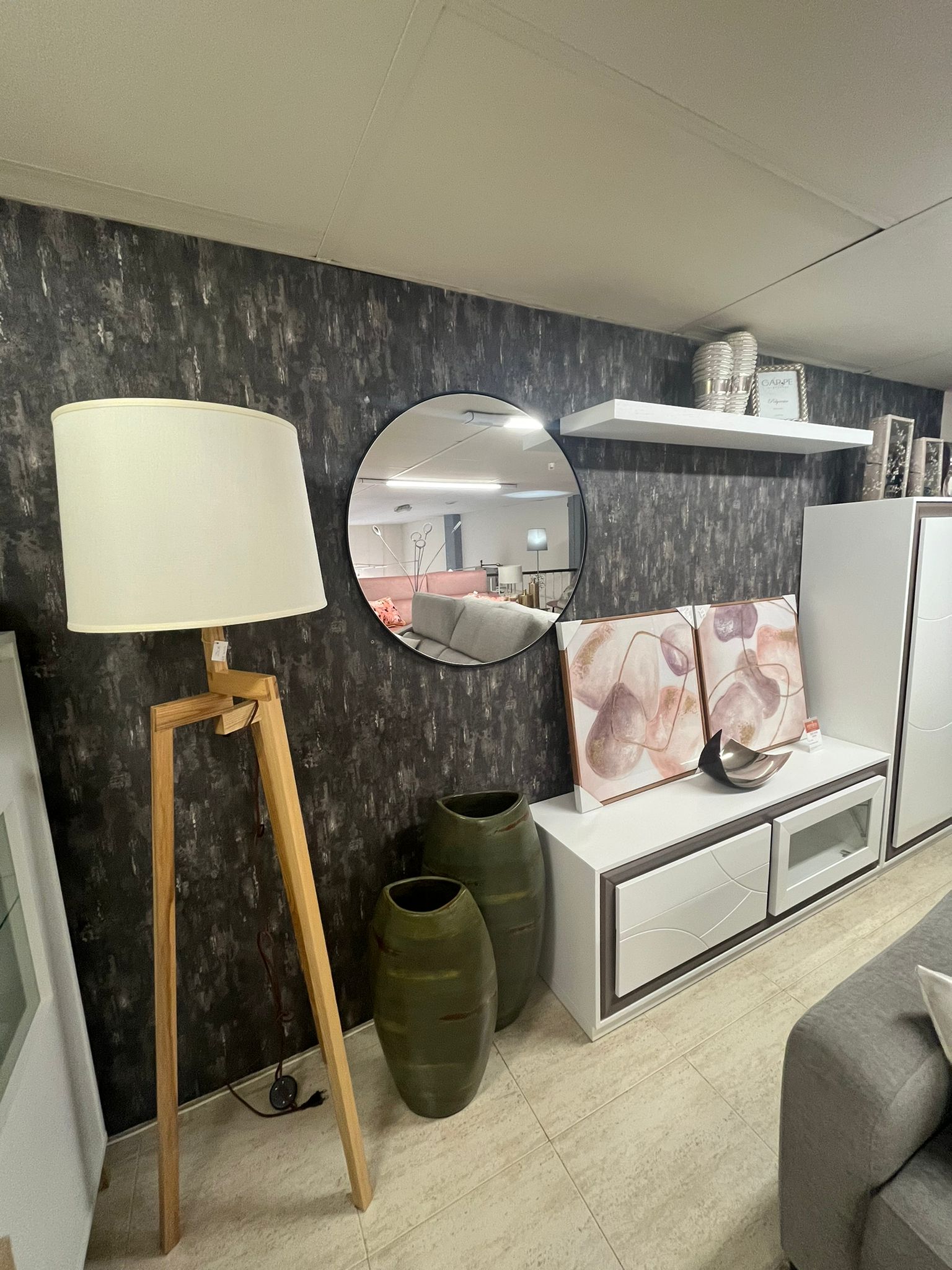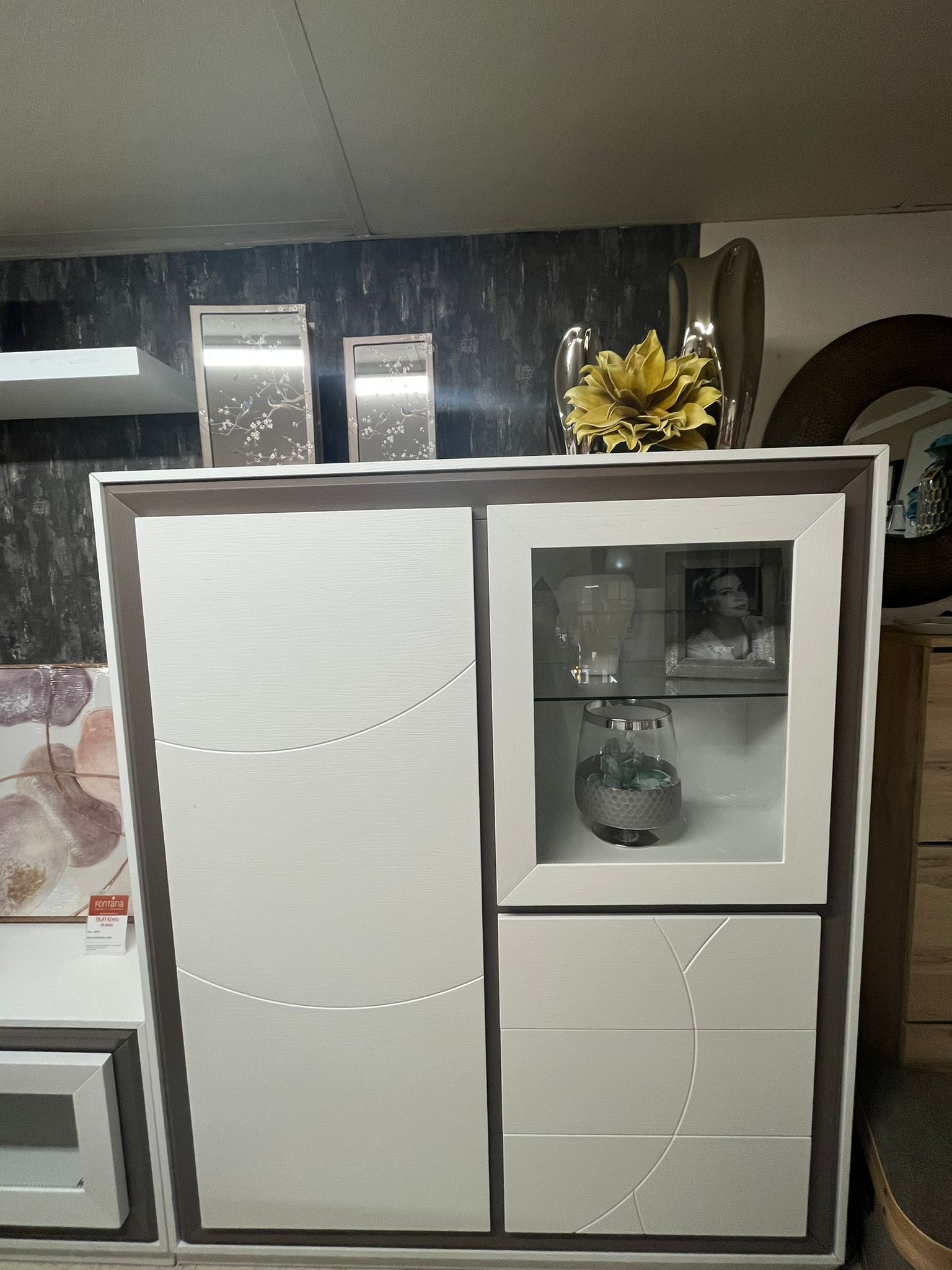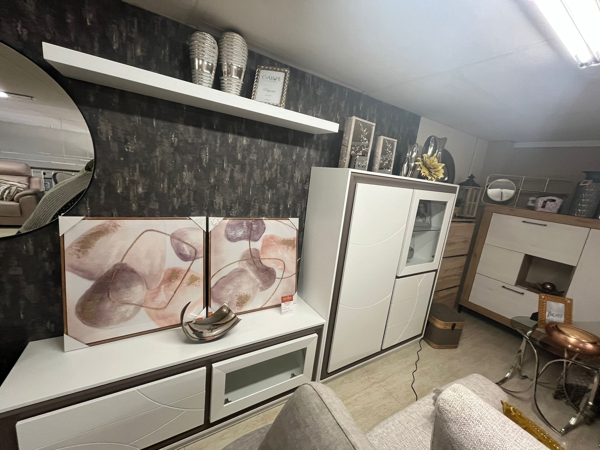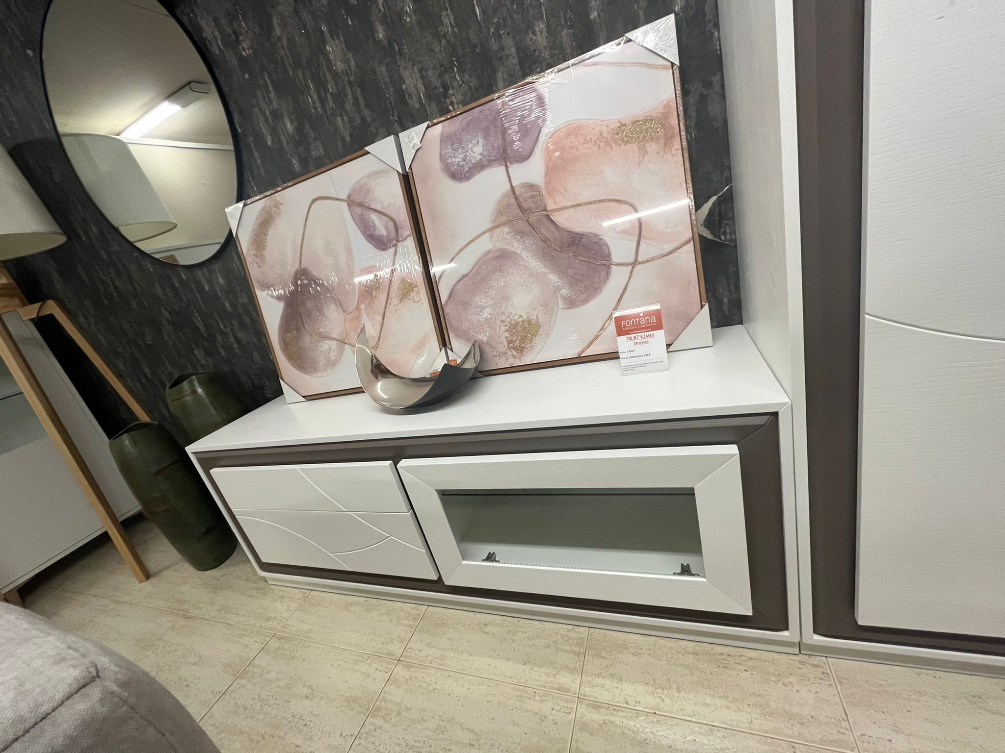 Composición salón con mueble TV, mueble bar y estante. En chapa natural. Medida 280cm
