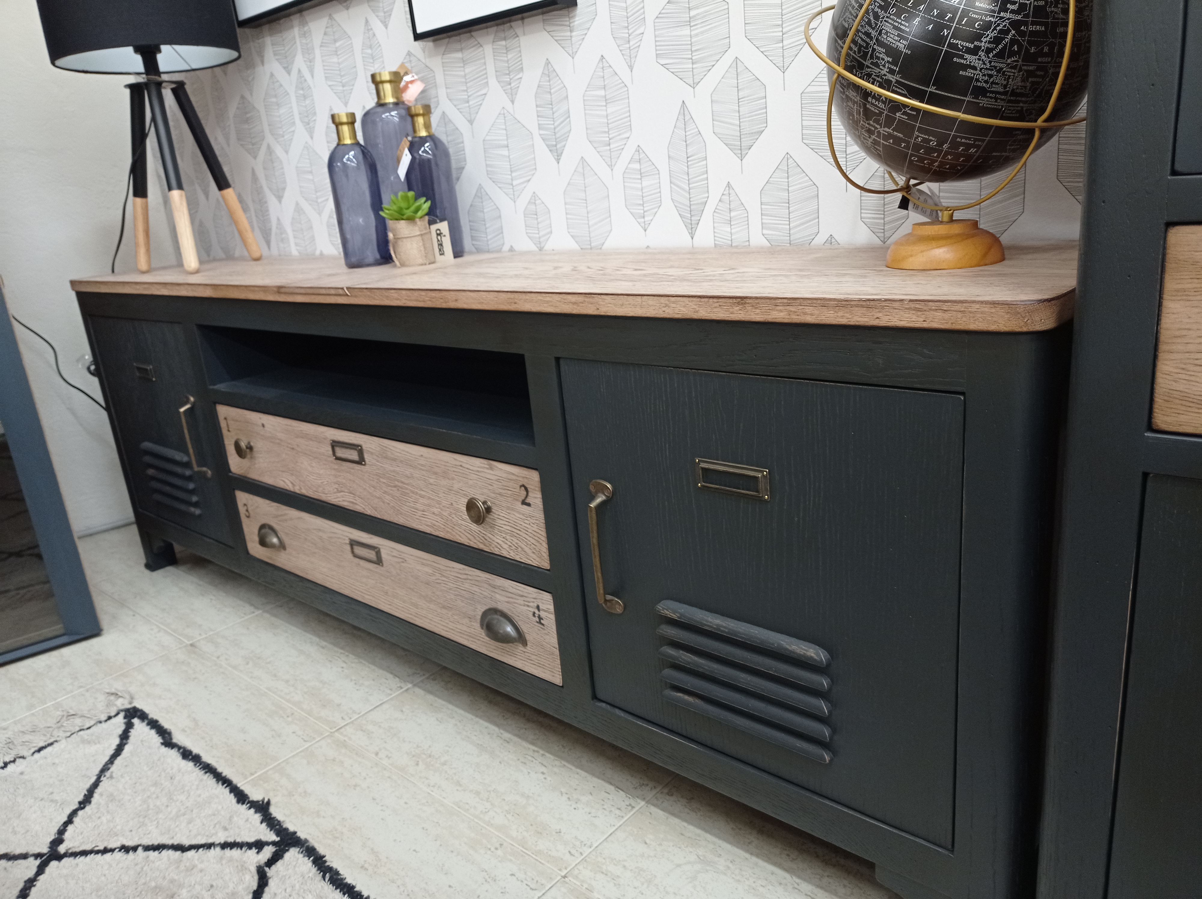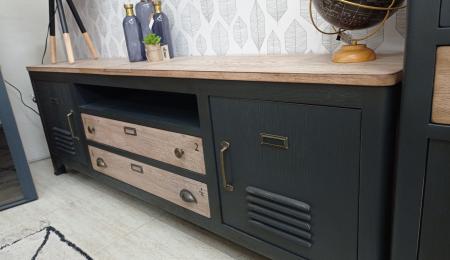 Mesa TV - 180 CM Roble macizo natural estilo industrial, con el roble al natural y lacado negro.