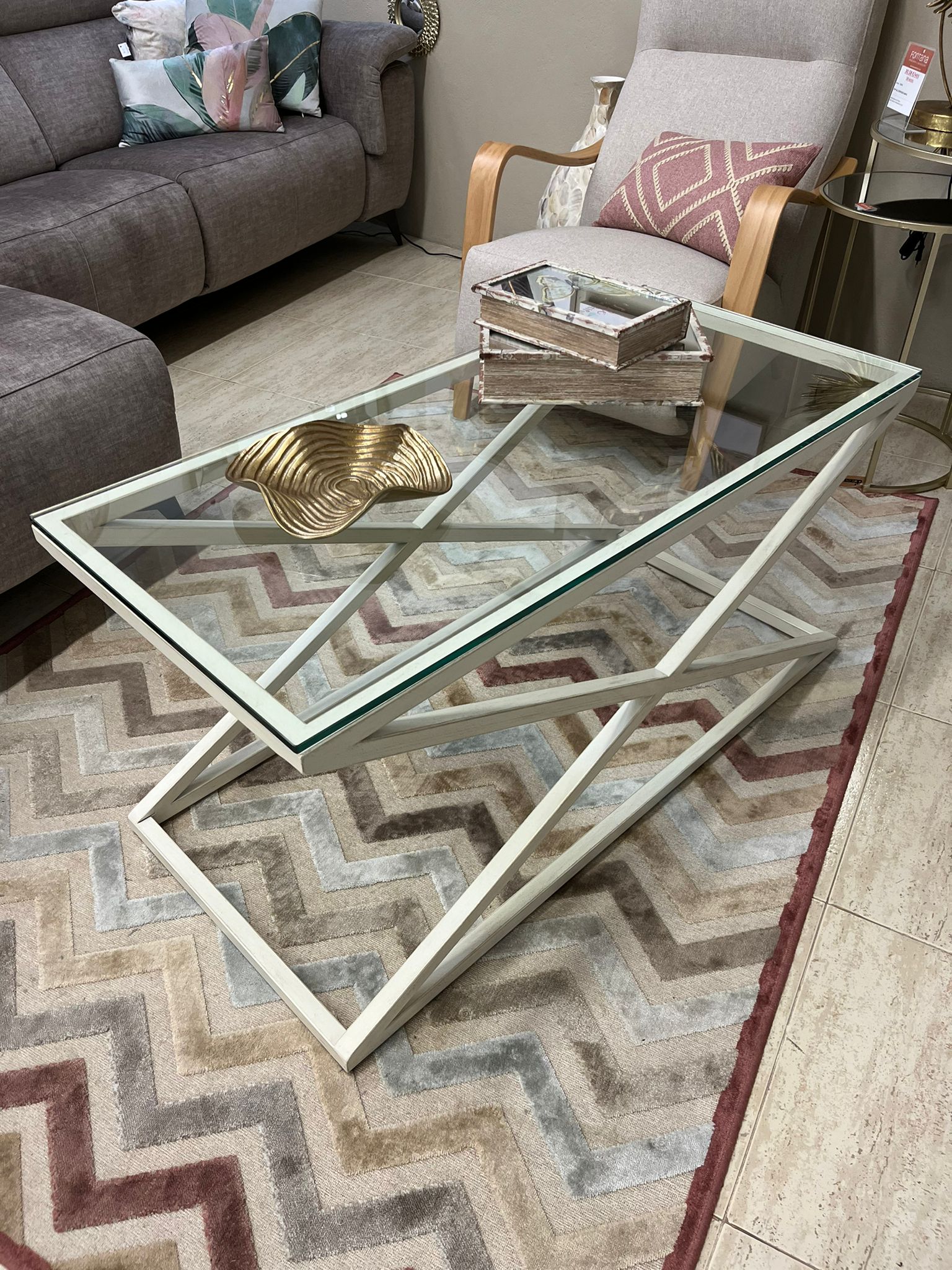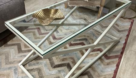 Mesa de centro con estructura de hierro en blanco roto envejecido y tapa de cristal. Medidas: 110cm largox50cm ancho x52cm alto