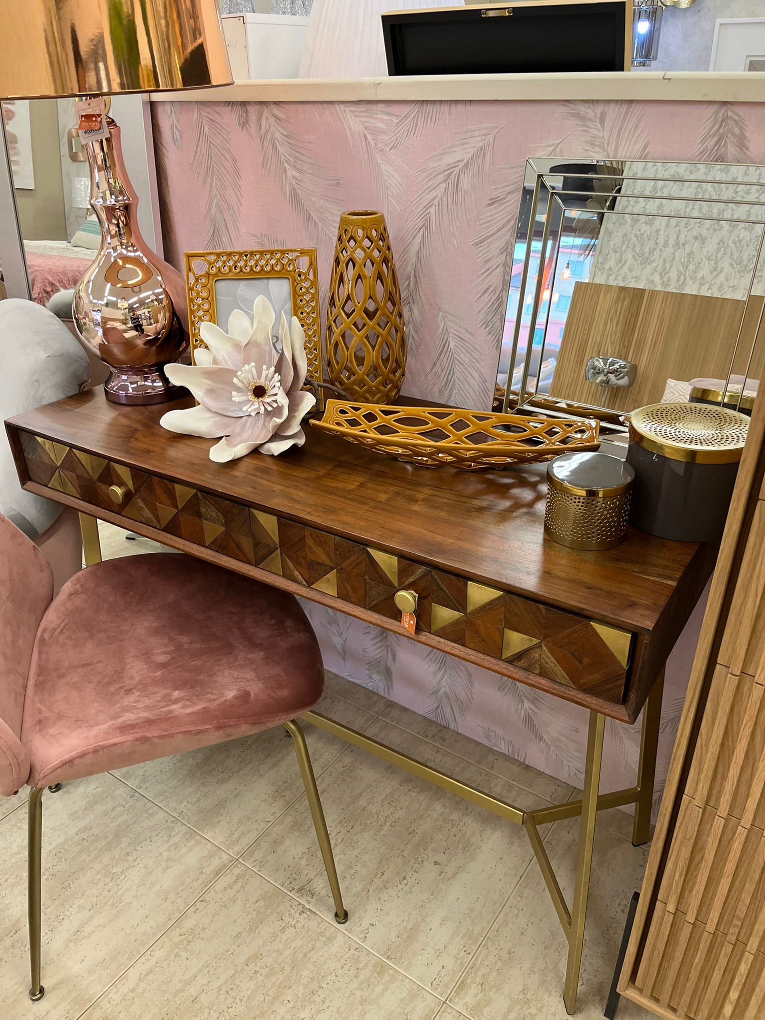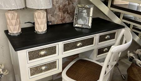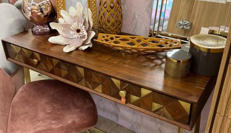 Mesa escritorio con dos cajones decorados con incrustaciones en dorado y patas en metal dorado.