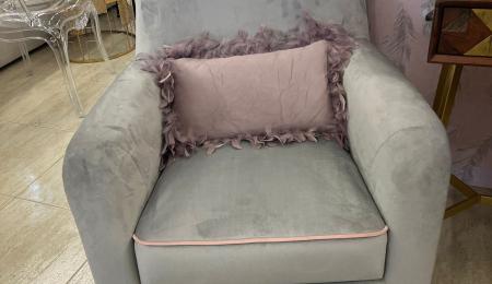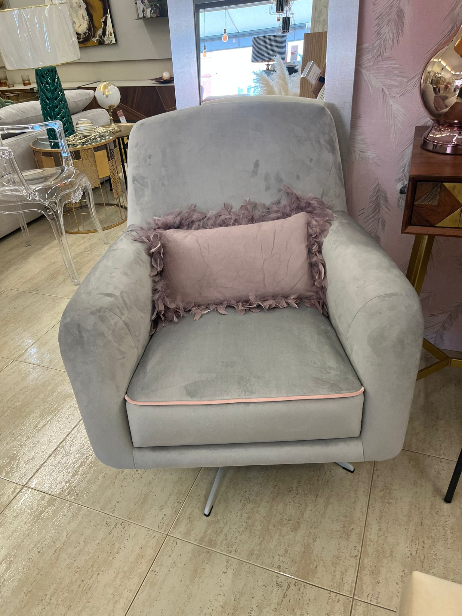Butaca tapizada giratoria con estructura metálica gris.
