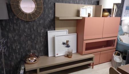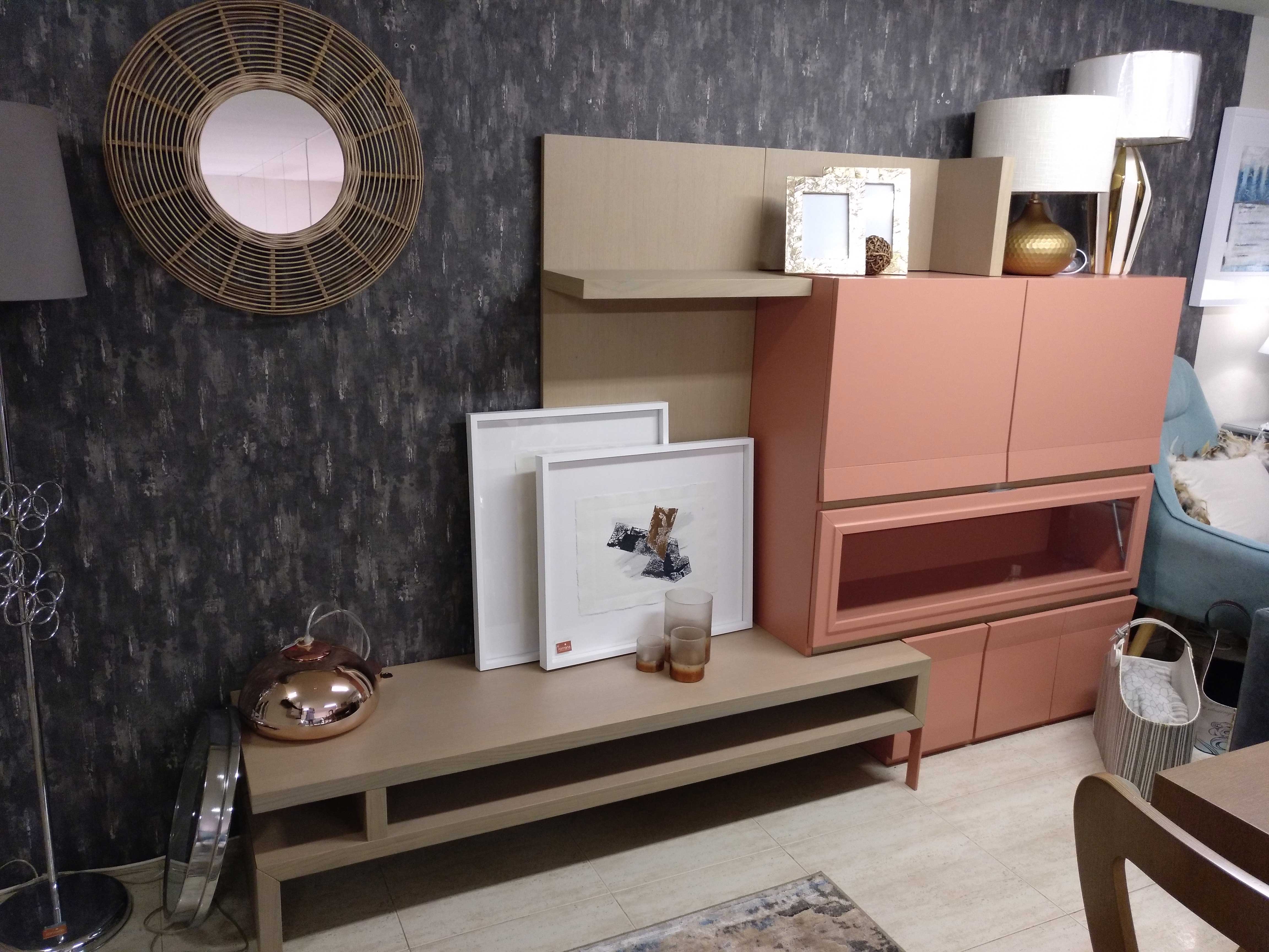 Composición de salón en chapa de roble natural y combinado con laca mate color salmón. Medida total: 255 cm
