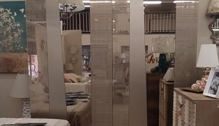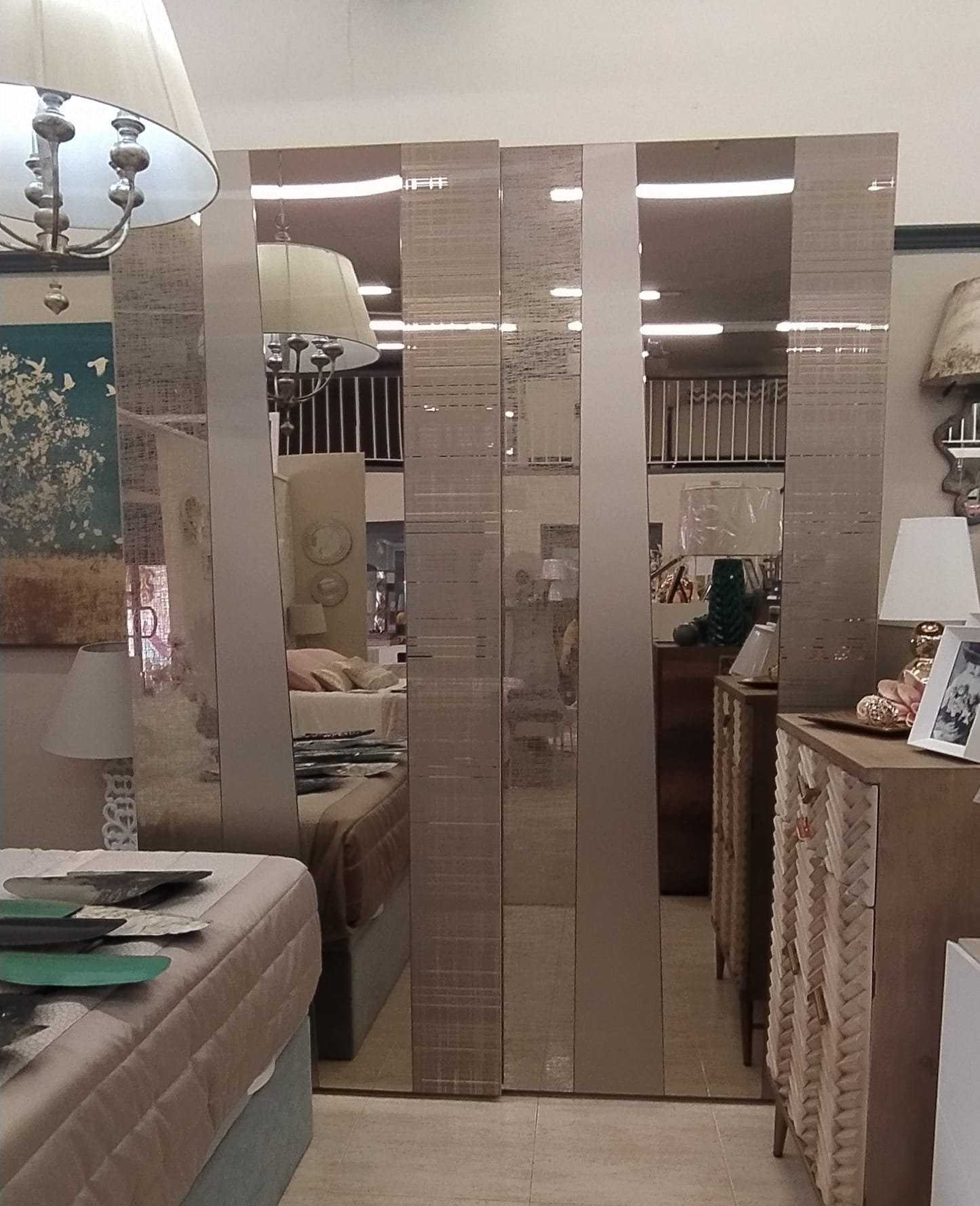 Armario italiano de puerta corredera con diseño en las puertas de espejos en color ambar. Medidas: 187.5 ancho x 63 fondo x 236 alto