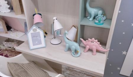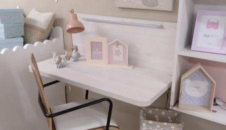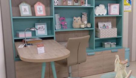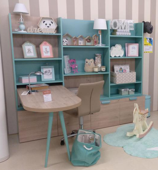 Dormitorio juvenil en chapa sintética de 4 cm de grosor. Incluye: Librero con estantes y puertas y mesa de estudio (210x40-150x180). De alta ca...